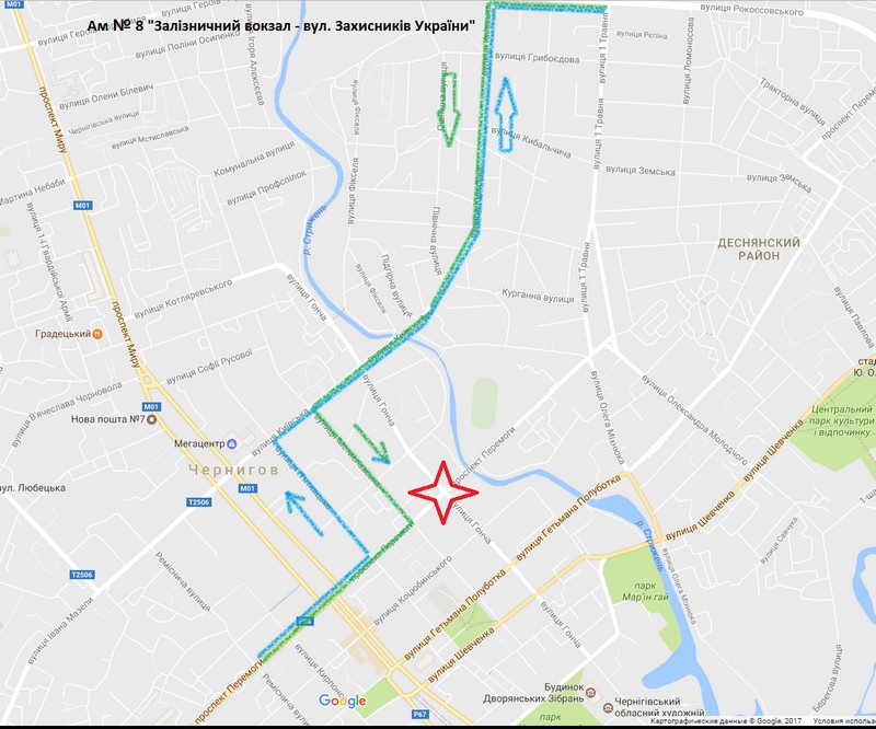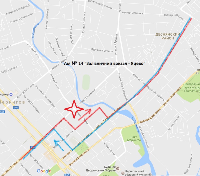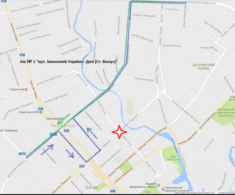 Пр. Перемоги – вул. Мстиславська – вул. Коцюбинського — вул. Пушкіна – вул. Гетьмана Полуботка – вул. О. Міхнюка – вул. 1-го Травня – вул. Рокоссовського – за маршрутом | вул. Рокоссовського – вул. 1-го Травня — вул. О. Міхнюка – вул. Гетьмана Полуботка – вул. П’ятницька – пр. Перемоги – за маршрутом |