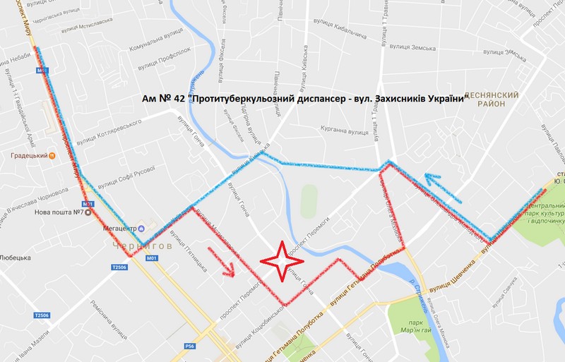 | № 42 «Протитуберкульозний диспансер — вул. Захисників України» | Пр... Миру – вул. Київська — вул. Мстиславська – вул. Коцюбинського — вул. Пушкіна - вул. Гетьмана Полуботка — вул. О. Міхнюка — Вул. О. Молодчого – за маршрутом | Вул. О. Молодчого – вул. Л. Боднарука – вул. Київська – за маршрутом |