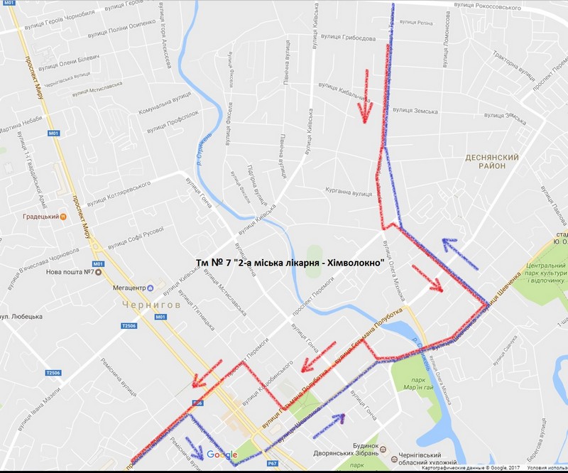 | № 7 «вул. Єськова – міст р. Десна» | Пр. Миру – пр. Перемоги – вул. Мстиславська – вул. Коцюбинського – вул. Пушкіна – вул. Гетьмана Полуботка – вул. О. Молодчого – за маршрутом | Вул. О. Молодчого – вул. Гетьмана Полуботка – вул. П’ятницька – пр... Перемоги – Пр. Миру – за маршрутом |