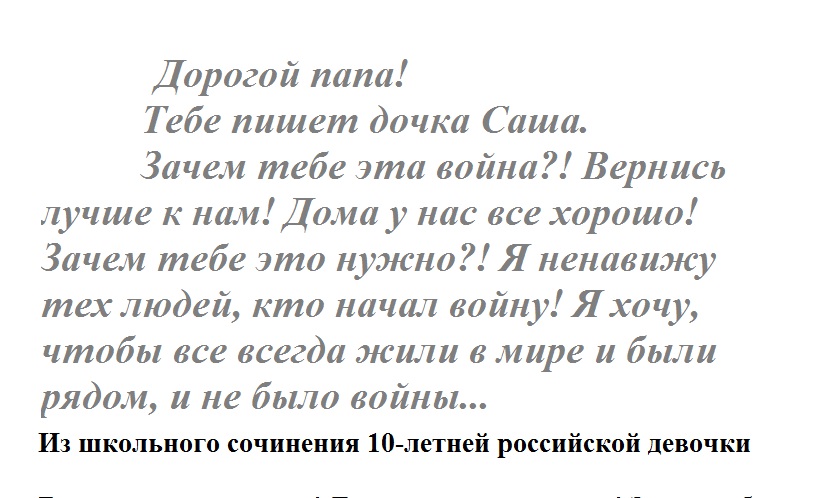 Здравствуй, дорогой папа! Тебе пишет дочка Саша. Совсем недавно ты был дома. Помню, как мы с тобой играли, гуляли. А сейчас ты на фронте. Мы очень за тебя волнуемся и переживаем. Больше всего я хочу, чтобы ты вернулся целым и невредимым. Мы с мамой молим Бога о том, чтобы ты вернулся.